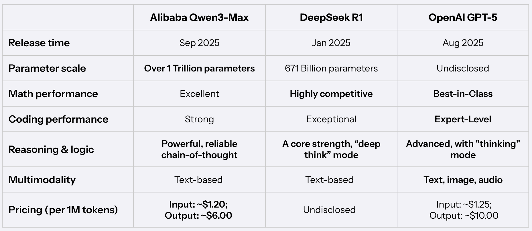 Let’s put the three titans in the ring: Alibaba’s Qwen3-Max, DeepSeek R1, and OpenAI’s GPT-5.